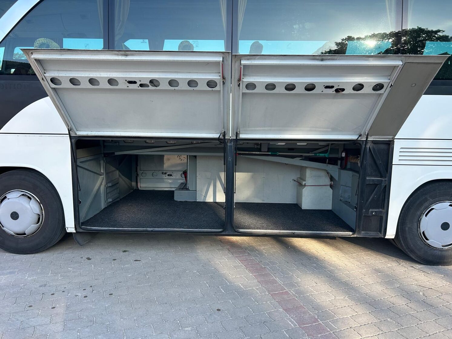 kондиционер, oтапливаемый салон, oткидывающиеся сидения, микрофон, вместительные багажники. Габаритные размеры: высота 3.75 м, длина 10.10 м, ширина 2.55 м.